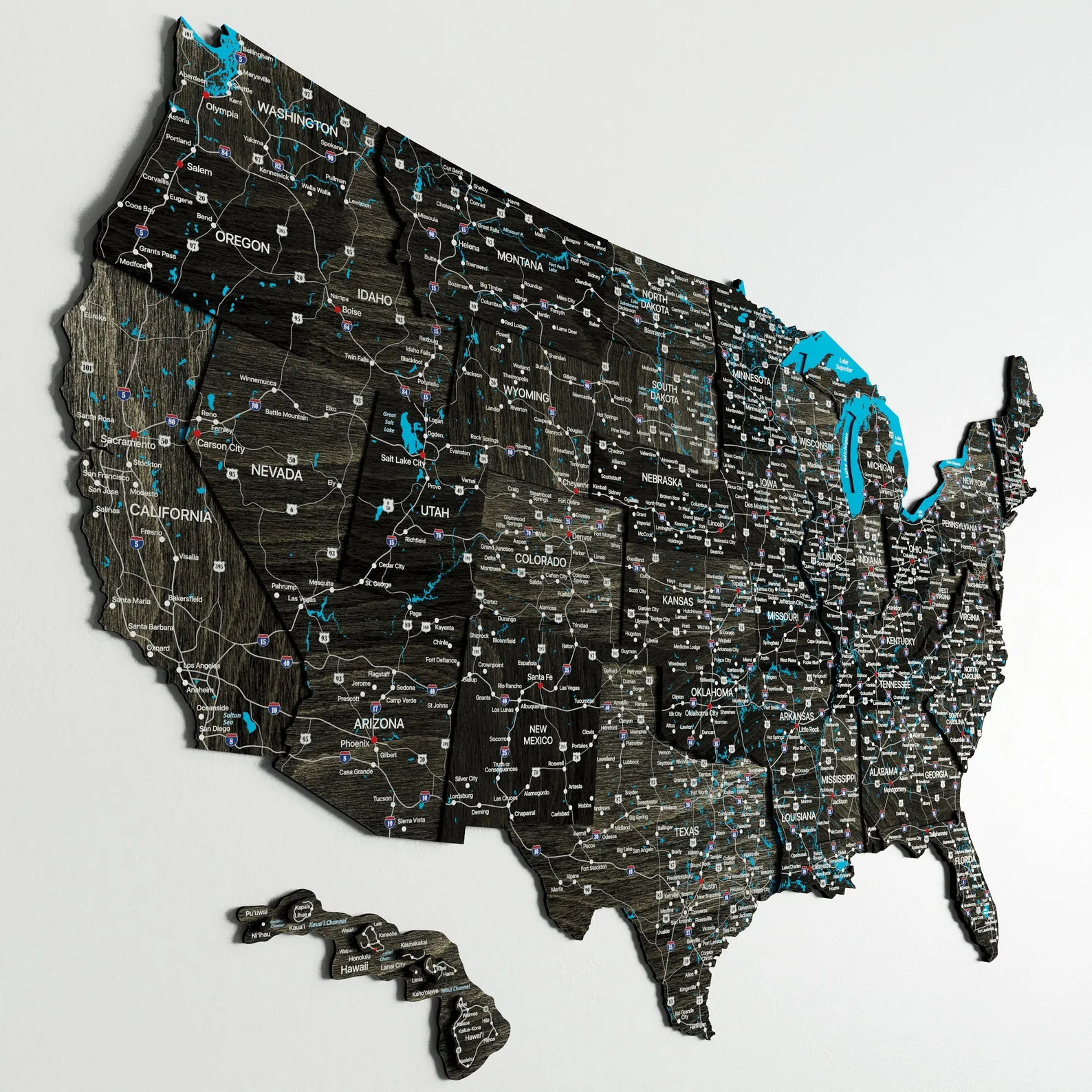 This detailed wooden United States wall map is made for home and office decoration where a clear view of the country is useful. The design combines a wooden backing with defined state borders and fine map lines, creating a tidy visual that remains easy to read from a distance. It works well in meeting rooms, reception areas or home study corners.