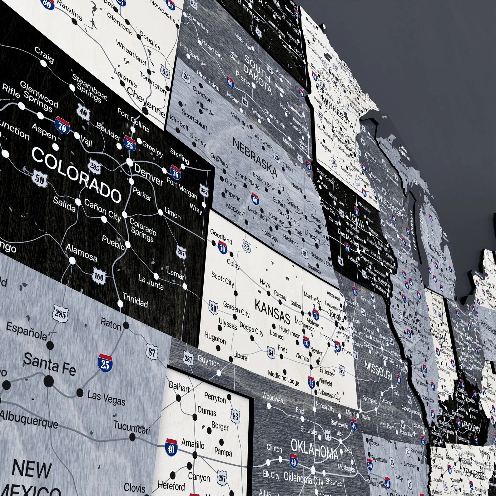 This monochrome wooden United States push pin map is designed as simple wall art for travel lovers. The single tone finish highlights the outline of the country and each state without using strong color contrast, so the map blends easily with neutral interiors in living rooms, hallways or home offices.