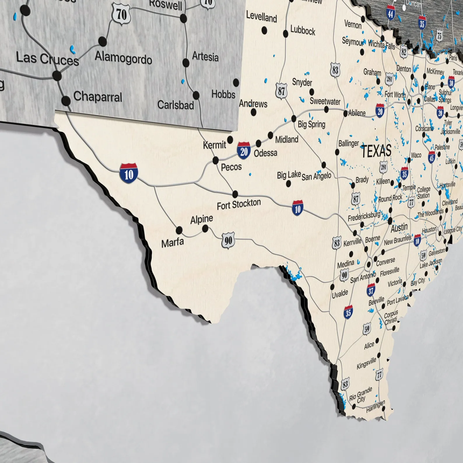 The map is decorative wall art made from wood and printed details and is recommended for indoor use. It does not include electronics or illumination and should not be exposed to continuous moisture. Mounting accessories are not described, so please select suitable hanging hardware that matches both the weight of the map and your wall material.